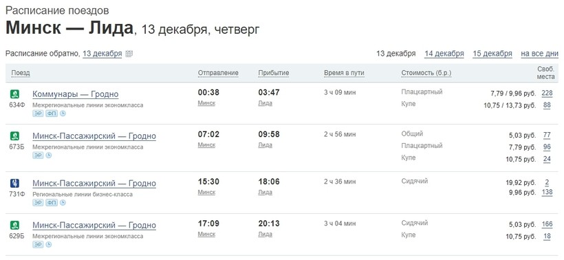 Стоимость проездного документа в данном случае зависит от категории места. В поездах по маршруту Минск — Лида есть следующие типы: