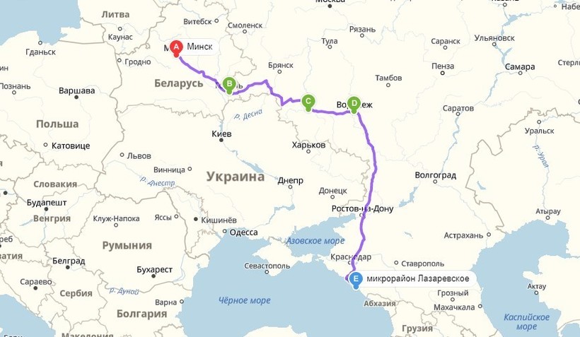 Ехали с приятелем, почти без перерывов, сменяя друг друга за рулем по мере усталости. Маршрут прорабатывали очень тщательно. Границу Украины пересекать не хотелось. Думали рвануть через Москву, но испугались пробок. В итоге было решено проехать через несколько крупных белорусских и российских городов: Бобруйск, Гомель, Курск, Воронеж, Ростов-на-Дону. Вот наш маршрут:
