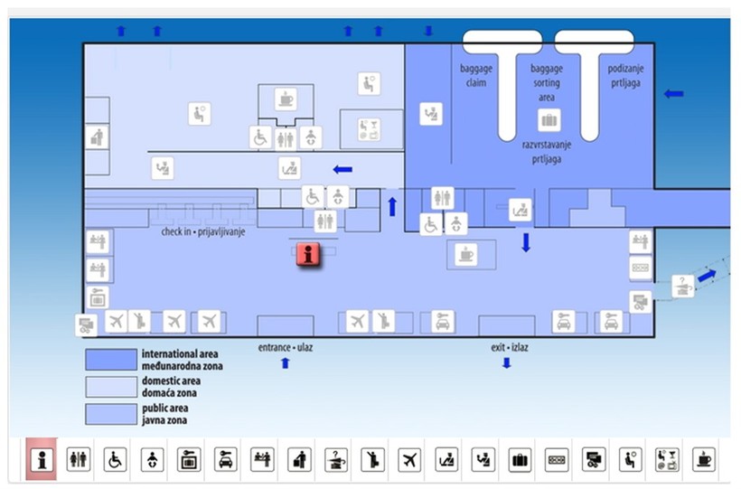 Мне кажется, большинство рейсов прилетает именно сюда. Но аэропорт очень маленький, даже у нас в городе побольше будет. Между прочим, именно этот аэропорт получил награду как лучший небольшой международный аэропорт:) В аэропорту есть целых два терминала, второй открыли лет 10 назад, потому что первый терминал не справлялся с большим потоком пассажиров. Из Москвы рейсы прилетают чаще всего именно сюда. Самым сложным лично для меня оказалось найти в данном аэропорту туалет. Вроде и указатели есть, но они очень странные. В общем, сразу сообщаю неимоверно важную информацию - туалеты находятся на первом этаже за информационной стойкой:) В принципе, в аэропорту неплохо развита необходимая инфраструктура - есть и небольшие кафешки, парковка, отделение банка, всякие киоски с мелочами. Стоек регистрации немного, на них обычно достаточно большие очереди, но работают черногорцы шустро:) А еще у нас почему-то не отобрали нашу бутилированную воду, мы с ней спокойно прошли в самолет, когда улетали обратно:) Я бы сказала, что мне очень понравился аэропорт, если бы тут был нормальный «Дьюти фри». Но более отвратного «дьютика» я еще не встречала. Я заранее отложила 200 евро на покупке в магазине беспошленной торговли, не съездила из-за этого на пару экскурсий, предвкушая отличный шоппинг. По итогу меня встретили пару стоек с косметикой, столько же с алкоголем и всякими сладостями. Косметика вся валяется в каком-то жутком беспорядке, алкоголь стоит как и у нас в России, а местные продукты гораздо дороже, нежели в местных лавках. Зато очереди просто огромные, а работают всего три кассы. Причем там очень странная система обслуживания. Не успеваете Вы выбрать товар, как тут же подлетает продавщица и забирает его, говоря что Ваши покупки будут на кассе. А на какой кассе не уточняется:) Короче с горя я накупила всякого шоколада на 100 евро и жутко злая ела его сразу в аэропорту:) Схему аэропорта прилагаю ниже.