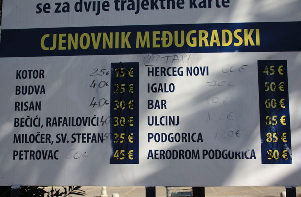 В высокий сезон таксисты необоснованно завышают цены. С ними можно и нужно торговаться. Они только за посадку берут 50 центов, а один километр стоит 80 центов. В среднем, такси от аэропорта Тивата до Бара будет стоить около 40-50 евро. Как видно на картинке ниже, в высокий сезон такси может стоить и 60 евро. Грабеж, как по мне:) И иногда таксисты специально едут очень медленно или по длинному маршруту, чтобы заполучить побольше денежек. Если путешествуете с ребенком, необходимо найти такси, где было бы детское кресло. Это очень важно.