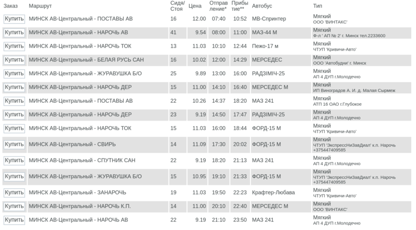Автобусов отсюда до Нарочи ходит более чем достаточно. Дабы убедиться в этом, следует посетить сайт по продаже автобусных билетов по всей Беларуси - ticketbus.by. Вот что там можно увидеть: