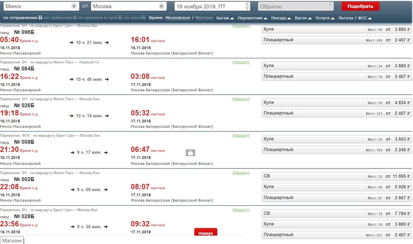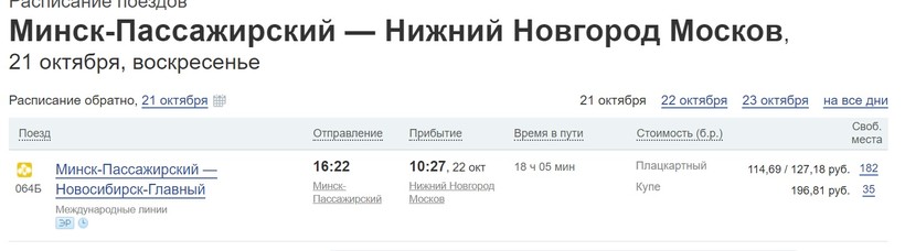 До Москвы билет обойдется в 1600 рублей (50 бел. руб.), а до Нижнего Новгорода 1100 деревянных (35 бел. руб.).