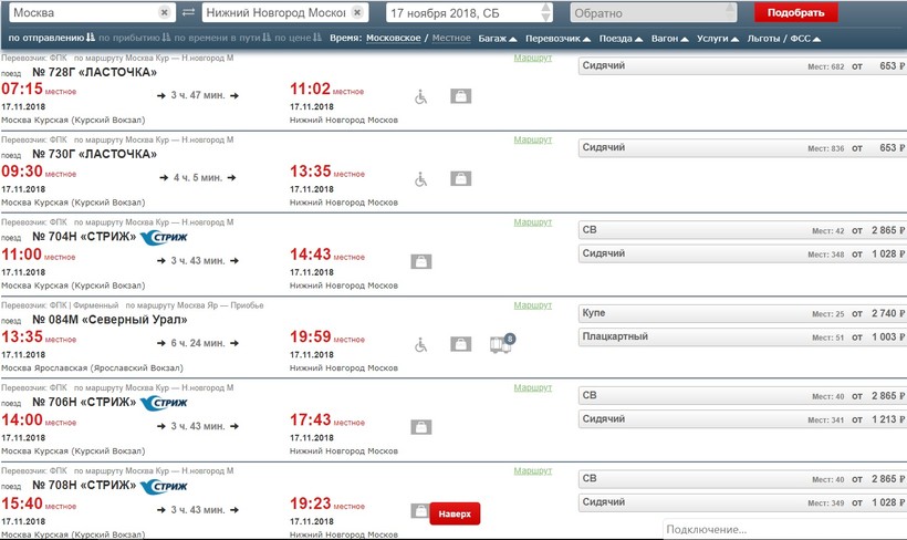 В направлении Нижнего Новгорода также очень много поездов ездит, выбор достаточно большой. Примерно каждый час-два есть какой-то вариант.