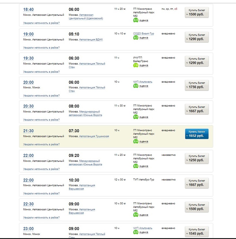 Примерно каждые полчаса начиная с шести вечера и до полуночи отправляется какой-то автобус с Центрального автовокзала в Минске. Ехать до Москвы примерно 10-12 часов. Вот куда прибывают автобусы из Минска:
