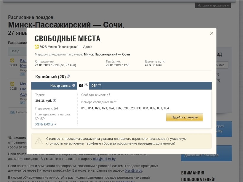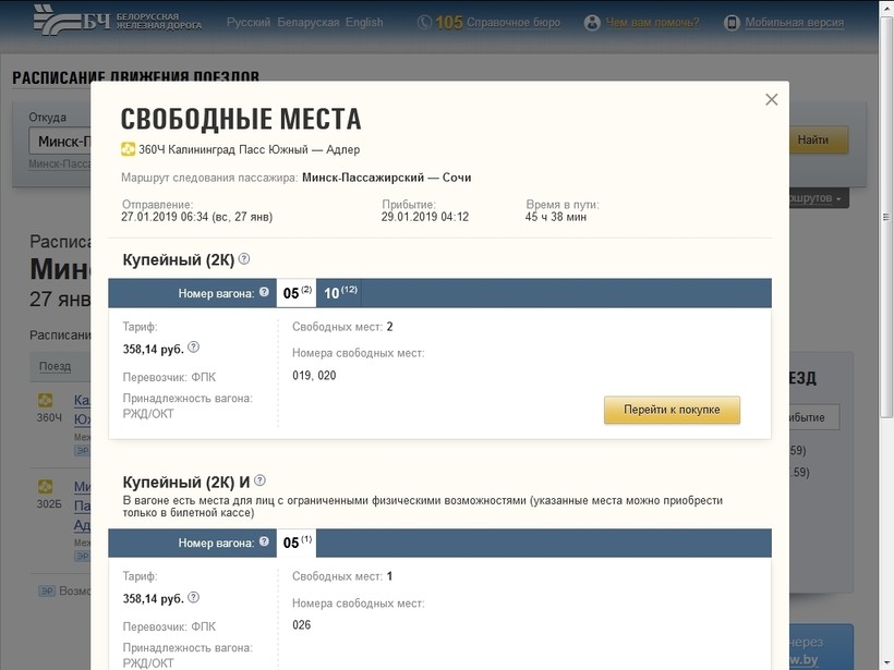 На поезд № 360Ч Калининград — Адлер: купе 358 белорусских рублей (11344 российских рубля).