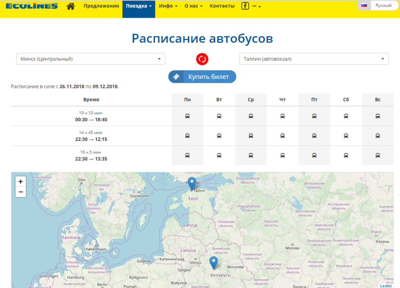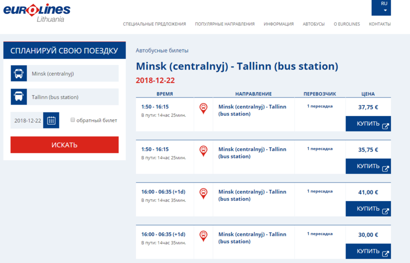 Рейс Минск – Вильнюс – Таллин выполняет автобусный перевозчик Eurolines регулярно два раза в день: