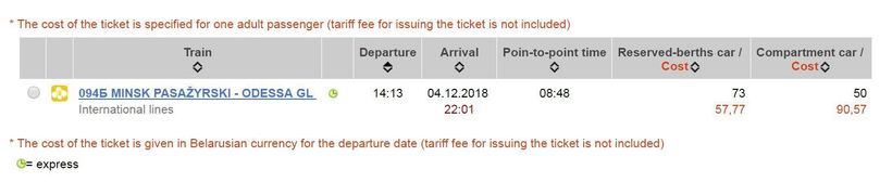 Цена билета стартует от 58 беларусских рублей (примерно 24 евро) за место в плацкартном вагоне.