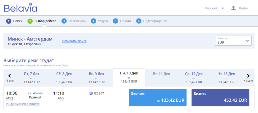 Беларусская авиакомпания Belavia совершает только один прямой рейс в сутки ежедневно, кроме вторника. Вылет из Международного аэропорта Минска в 10:30.