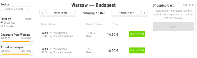 Далее от станции Warsaw West в 22:00 два автобуса отправляются в Будапешт. Маршрут выполняет автобусный перевозчик Flixbus.