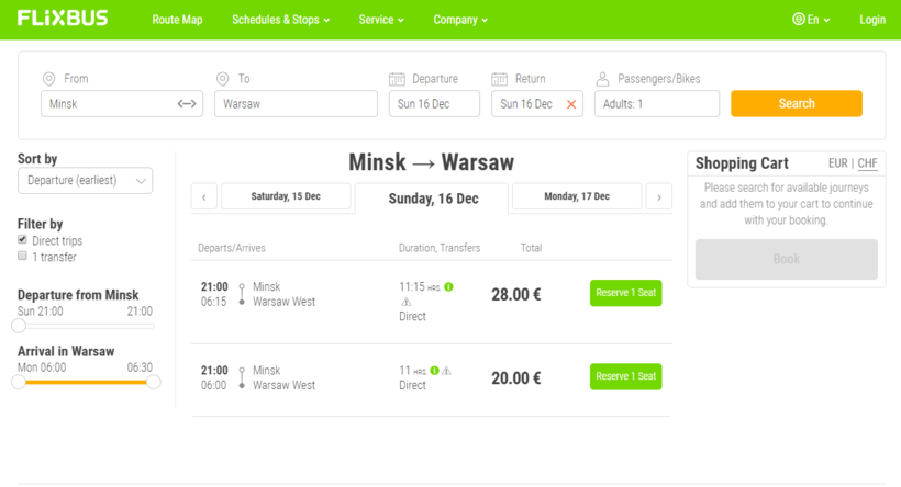 Итак, самый выгодный вариант маршрута — это поездка с пересадкой в Варшаве. Рейс Минск - Варшава выполняют несколько автобусных перевозчиков, вот к примеру расписание компании Flixbus, два автобуса в 21:00