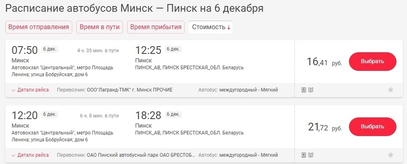 Ниже приведена информация о том, сколько часов вам потребуется, чтобы добраться от Минска до Пинска, а также приведена примерная стоимость проезда (средняя цена билета) на том или ином виде транспорта.