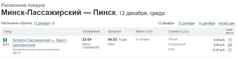 Белорусская железная дорога — это удачный вариант путешествия из Минска в Пинск. Ну, во-первых, это более комфортно, чем автобусом, особенно, если покупаешь билет в плацкартный вагон или даже купе (возможно, некоторые любит шикануть и ехать с максимальным комфортом). Ну, во-вторых, безопаснее. Вот не доверяю я автотранспорту и все. Но это только мое личное мнение, их вам не навязывает. Так вот, каждый день между городами курсирует несколько поездов, как скоростных пассажирских, так и эконом класса.