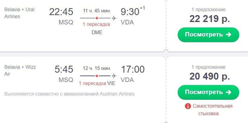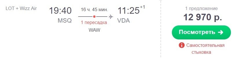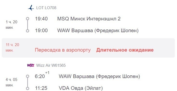 Если выберете данный вариант, то вам предстоит так называемая самостоятельная стыковка. Возможно придется пройти регистрацию на каждый рейс по отдельности. Вам нужно, прежде чем выбирать такой вариант, убедиться, что хватит на это времени. В данном случае такая возможность есть, потому что следующего рейса в аэропорту нужно ждать 11 часов и 20 минут. Авиаперелеты выполняют еще авиакомпании: LOT и Wizz Air.