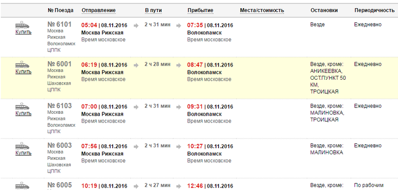 А теперь нужно сделать последний рывок и сесть на электричку до Волоколамска, отправляются они ежедневно, практически каждый час. На фото ниже видно, что на завтра на весь день есть электрички, первая отправляется в 05:04, а последняя в 22:23.
