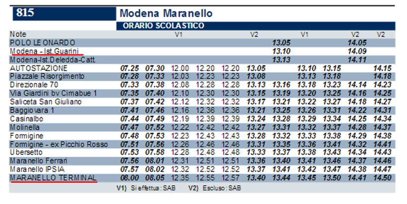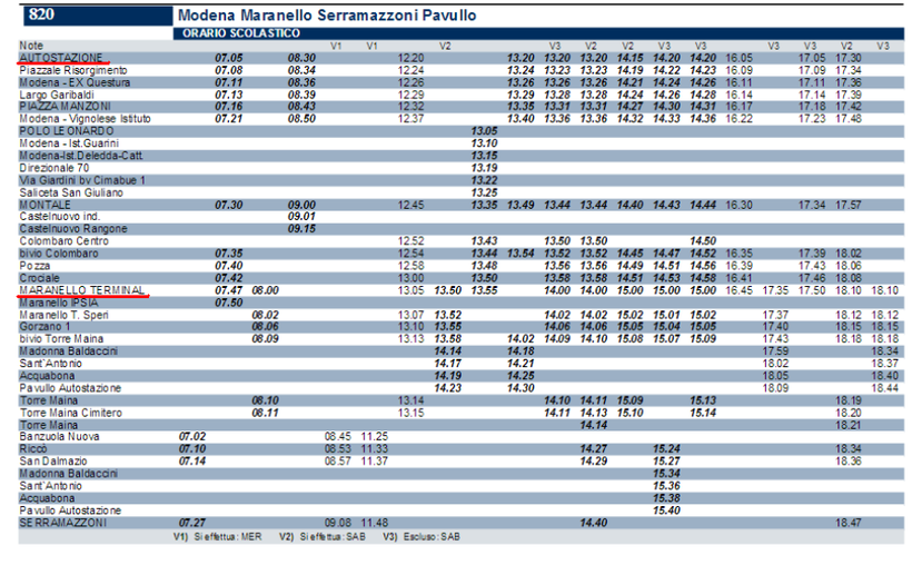 - №820. Первый автобус выезжает в 07:05, последний – в 17:30. В Маранелло автобус делает несколько остановок, в том числе и на железнодорожном вокзале.