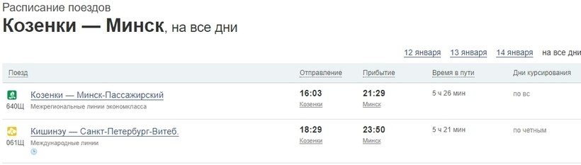 Со станции Козенки в Минск поезда ездят несколько раз в неделю (не каждый день, график можно посмотреть на сайте Белорусской железной дороги).
