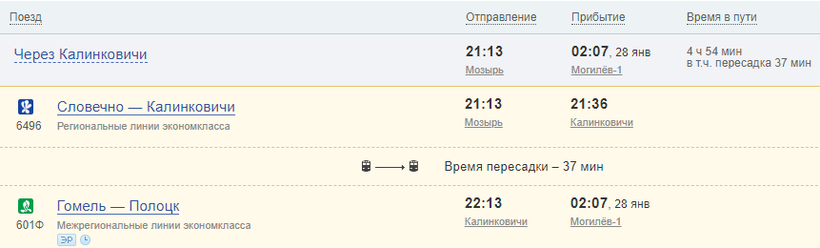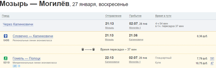 Билет на поезд из Мозыря до Калинковичей стоит всего 0,36 BYN или 11 руб. А поездка из Калинковичей до Могилева обойдется от 7,79 BYN или 240 руб.