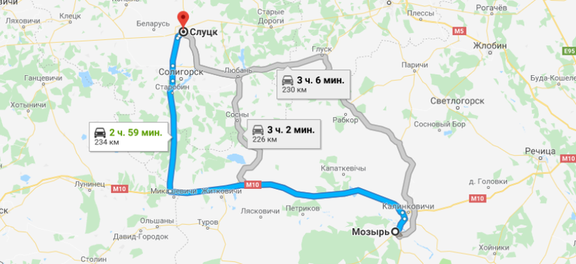 Есть три основных автомобильных маршрута между городами, которые незначительно отличаются по километражу. Я обычно предпочитаю ехать по трассе М10 до Микашевичей, а дальше свернуть направо на дорогу Р23, которая прямиком идет до Слуцка. Этот маршрут я люблю больше, потому что трасса М10 по качеству лучше остальных дорог на маршруте.