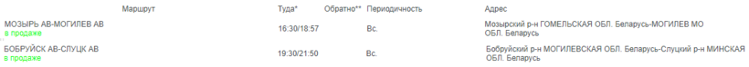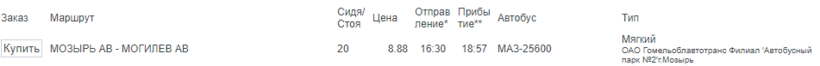 - выезд из Мозыря в 16:30 и прибытие в Бобруйск в 18:57;