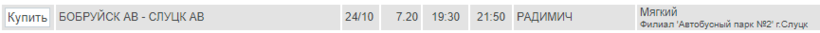 - выезд из Бобруйска в 19:30 и прибытие в Слуцк в 21:50.