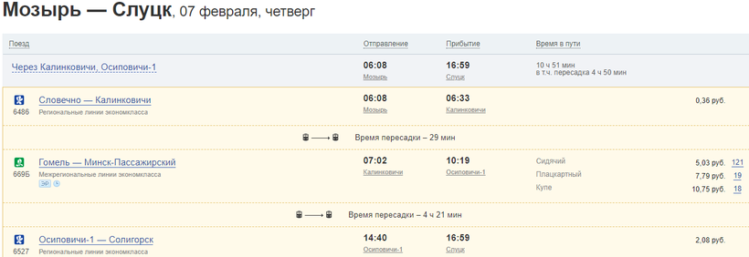 Поездка из Мозыря в Калинковичи обойдется в 0,36 BYN (10 руб.), из Калинковичей в Осиповичи — от 5 BYN (150 руб.), а из Осиповичей до Слуцка — в 2,08 BYN (65 руб.). Общая цена преодоления пути на поездах из Мозыря в Слуцк — 225 руб., что вдвое дешевле автобусов.
