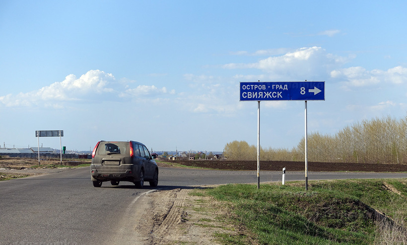 Ну а после того, как вы уже будете сидеть в машине, вам необходимо выехать из аэропорта и выехать на трассу М-7, вы будете ехать по мосту через реку Волгу, это в сторону Москвы. Далее вам необходимо доехать до деревни Исаково, найдите указатель, который показывает поворот на Свияжск. Поворот на Свияжск