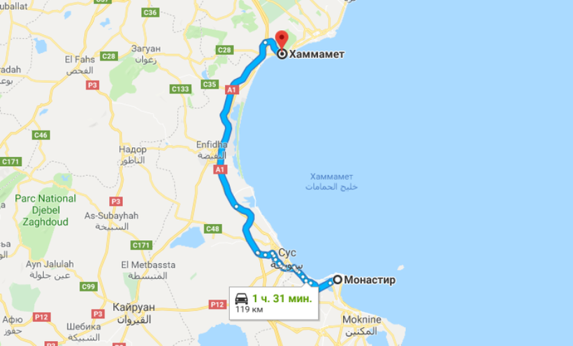 Монастир и Хаммамет разделяют почти 120 км, которые на машине можно проехать в среднем за 1,5 часа.