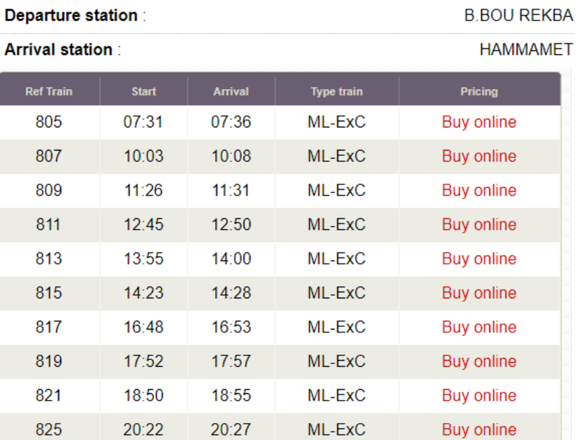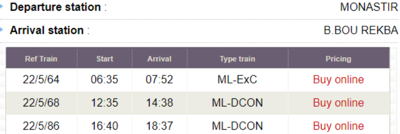 Узнать расписание поездов можно на сайте Национальной компании железных дорог Туниса. Там же можно приобрести билет из Монастира до Bir Bou Rekba. А вот из Bir Bou Rekba до Хаммамета билет можно купить только в кассах ж/д вокзала.