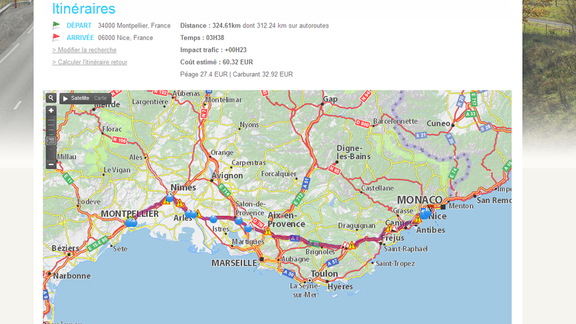 Через Монпелье и Ниццу пролегает скоростная автострада А8. Дорогу в 326 км можно преодолеть часа за 3,5-4. Сейчас на дороге ведутся ремонтные работы, поэтому движение может быть несколько затруднено.