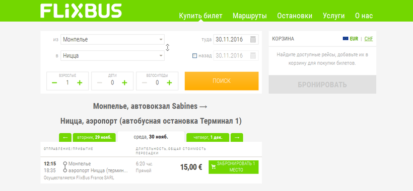 Автобусы компании FlixBus отправляются в Ниццу один раз в сутки в 12:15. В Ниццу он прибывает в 18:35. Обратите внимание, что автобус приезжает к аэропорту, а в сам город нужно будет добираться на местном транспорте.
