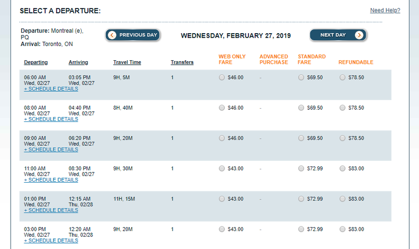 Отправление с Central Station в Монреале, а прибытие на Union Station в Торонто.