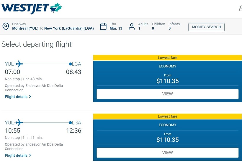 Из Монреаля в Нью-Йорк можно долететь и рейсом компании Westjet. Вылет в 07:00, 10:55, 12:59, 17:37. Лететь приблизительно 1 час 40 минут. Посадка в аэропорту Ла Гуардия.