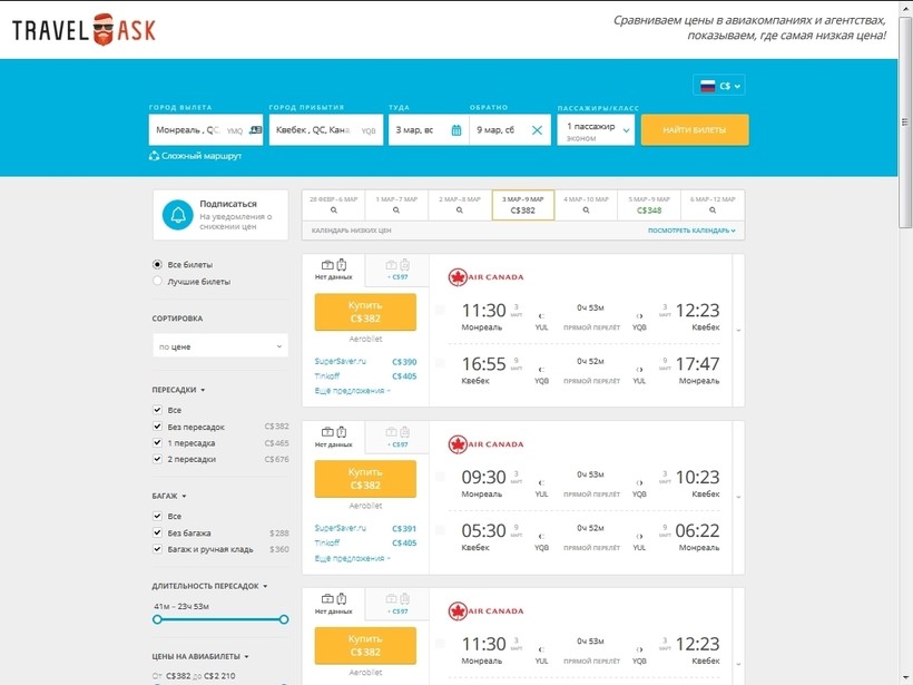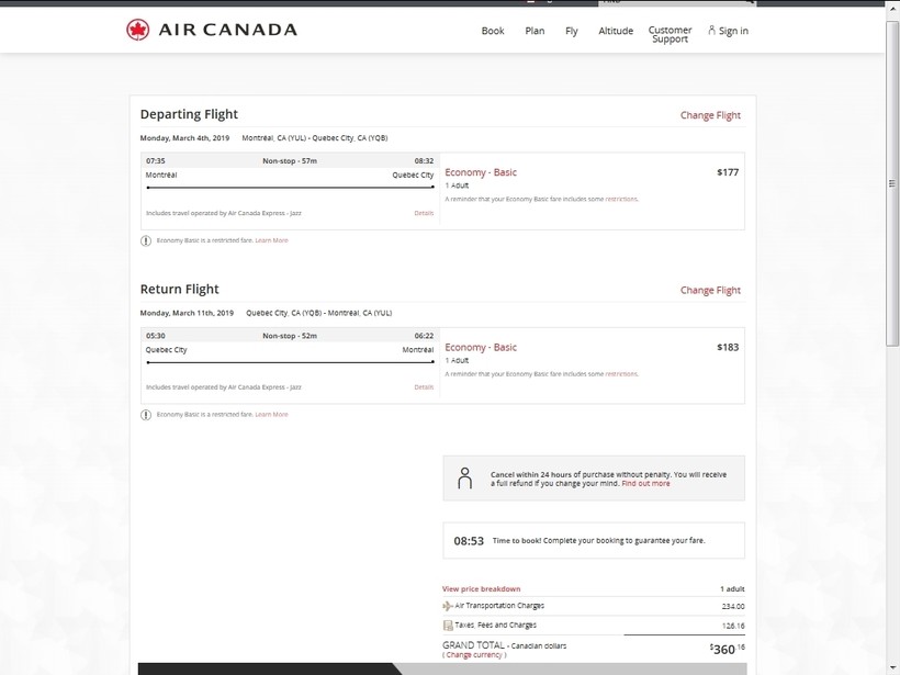 Билеты на рейс Монреаль — Квебек в оба конца стоят 360 C$ (272$).