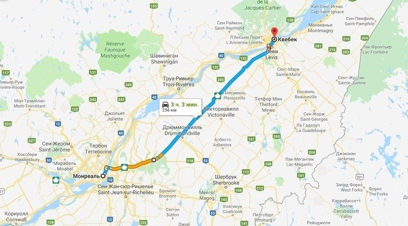 Монреаль — Квебек — маршрут на карте