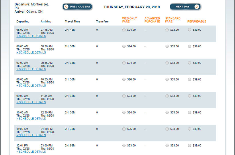 Первый автобус выезжает в 05:00, а последний — в полночь. Интервал движения составляет 1 час. Место отправления — Gare d'autocars de Montréal (1717 Rue Berri). Время в пути составит от 2:30 до 3:15 часов (в зависимости от рейса). Прибытие на Central Station в Оттаве (265 Catherine St).