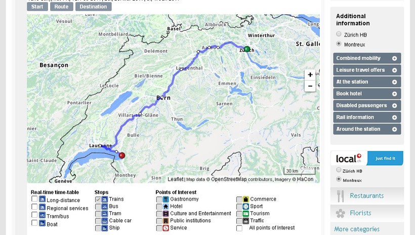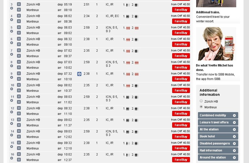 Монополистом в этой сфере в Швейцарии является корпорация SBB CFF FFS. По направлению из Цюриха в Монтре, она осуществляет рейсы ежедневно и поезда ходят каждый час. Вообще-то, поезда ходят даже чаще, но все с множеством пересадок. Сейчас я хочу рассказать о тех, которые имеют только одну пересадку, и в пути находятся около трёх часов. Потому что остальные, с двумя и более пересадками, идут по шесть и семь часов.