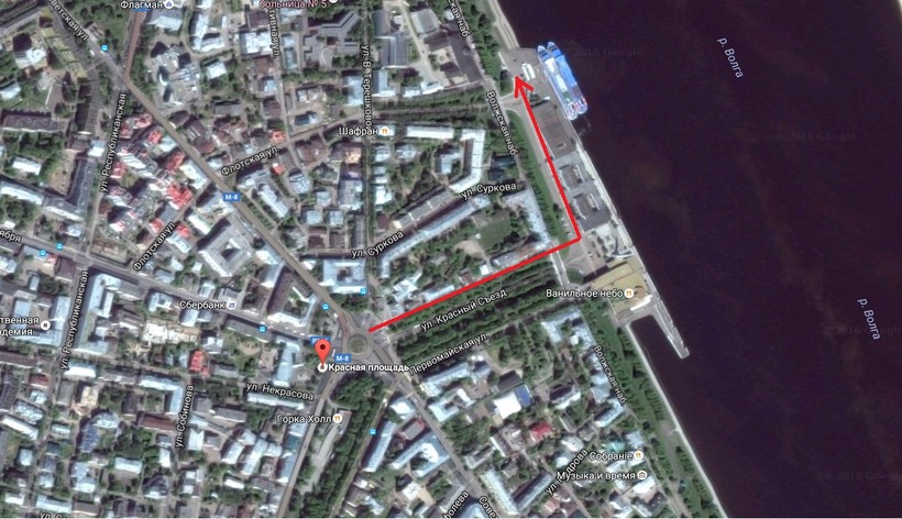 До речного вокзала можно доехать с пересадкой в Ярославле. Снова нужно сесть на автобус №183 и доехать до автовокзала, перейти дорогу и сесть на троллейбус №9 или автобус №97, 47, 91, 71, 94, 98, 33, 73. Транспорт ходит с 5 утра и до полуночи. Приблизительно через 10-15 минут нужно выйти на Красной площади и через сквер пройти на набережную.