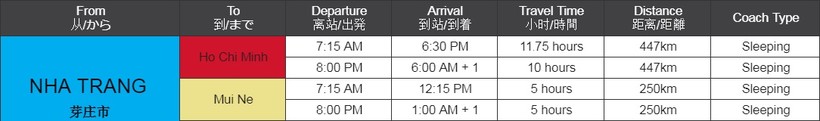 Всего ездят 4 прямых рейса: два у перевозчика Sinhtourist и два - у Hanhcafe. Расписание есть на сайтах, это два вечерних (в 20:00 и 20:30) и два утренних (в 7:15 и 8:00) рейса: