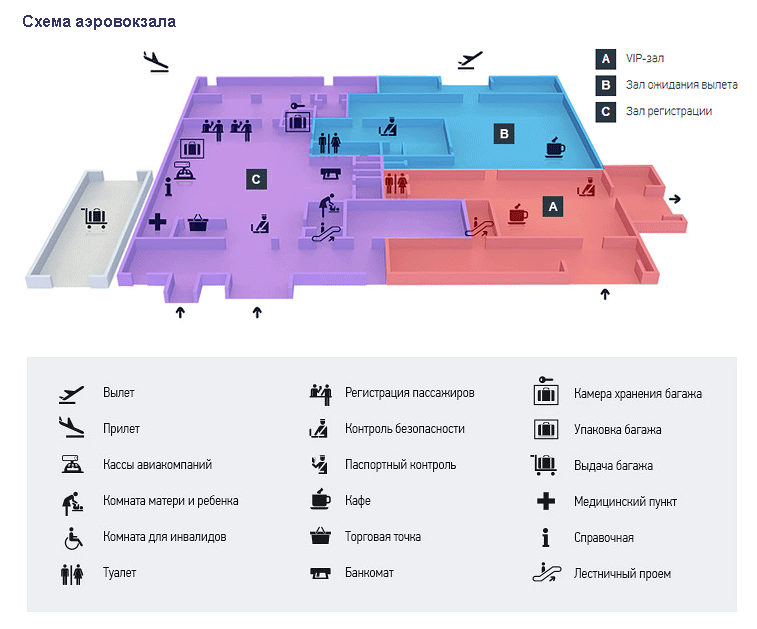 Как я уже говорила - очень маленький аэропорт. Находится на улице Пилотов, 1, (Солнцедарская, 10) совсем рядом с Сухумским шоссе и аквапарком Золотая Бухта. В аэропорту всего один выход и один вход. Потеряться или каким-либо образом не сообразить куда идти невозможно. По прилету автобус доставит вас к небольшим воротам, там можно будет получить багаж (практически на улице) и проследовать на выход. Всё очень просто. Ниже прикладываю схему аэропорта с указателями.
