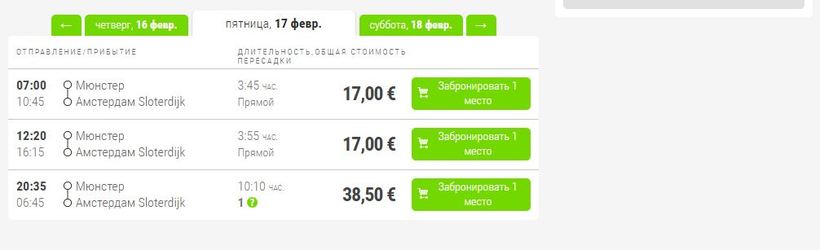 Ниже приведена информация о том, сколько часов вам потребуется, чтобы добраться от Мюнстера до Амстердама, а также приведена примерная стоимость проезда (средняя цена билета) на том или ином виде транспорта.