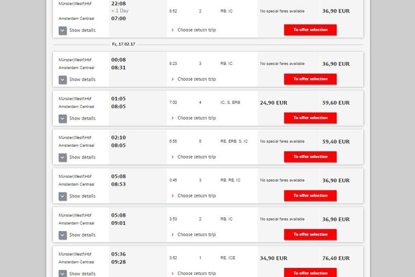 А теперь о вариантах, связанных с железной дорогой. Ходят по данному направлению разные поезда, классов RB, RE, ICE, IC и т.д. Про все эти поезда можно прочитать вот в этой занимательной статье.