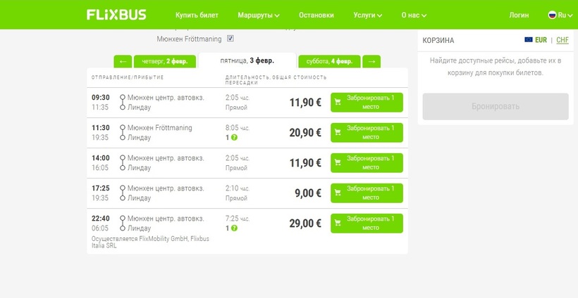 Этот вариант путешествия в Линдау не очень удобный. Сейчас расскажу почему. Смотрите, ежедневно в этом направлении от центральной автостанции Мюнхена отправляется от двух до пяти рейсов компании Flixbus.