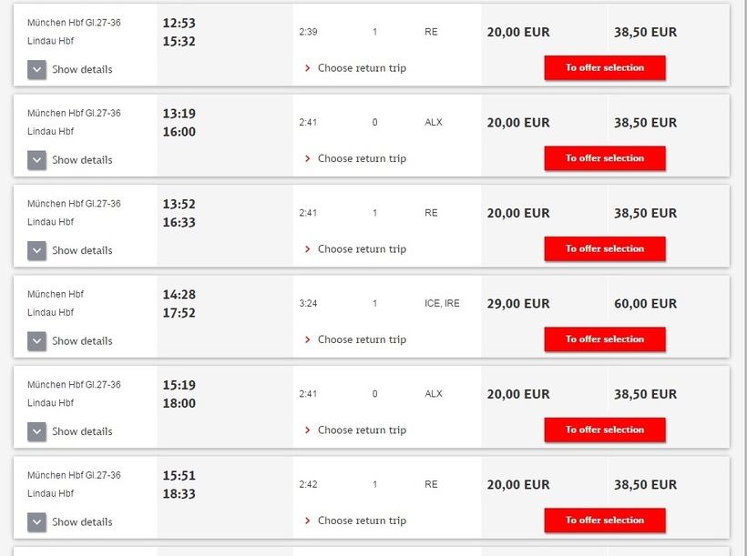 Ежедневно из Мюнхена в Линдау практически каждые полчаса отправляются поезда различных категорий. Вот фрагмент расписания.