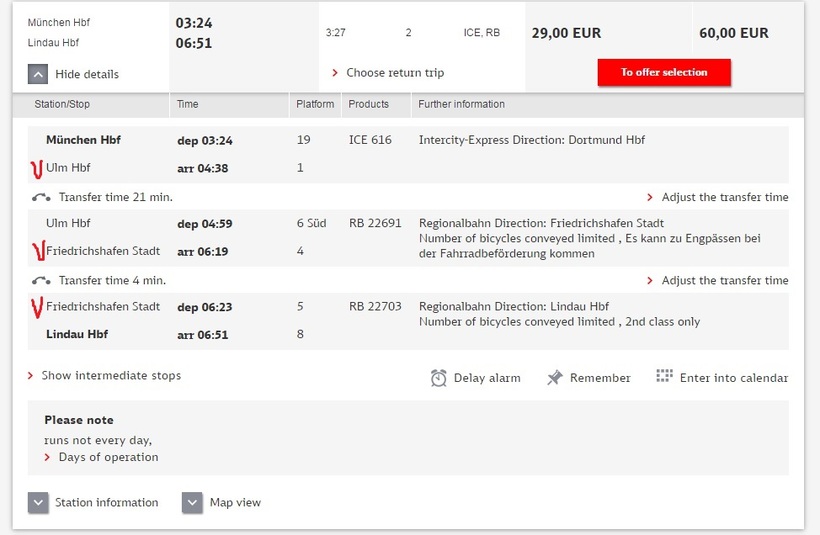 Более подробно можно посмотреть на сайте Deutsche Bahn. Правда, путешествие на поезде может быть связано с определенными неудобствами. Некоторые рейсы предусматривают необходимость пересадки в Ульме или Бухлоэ. А вот, например, рейс в Линдау с несколькими пересадками.