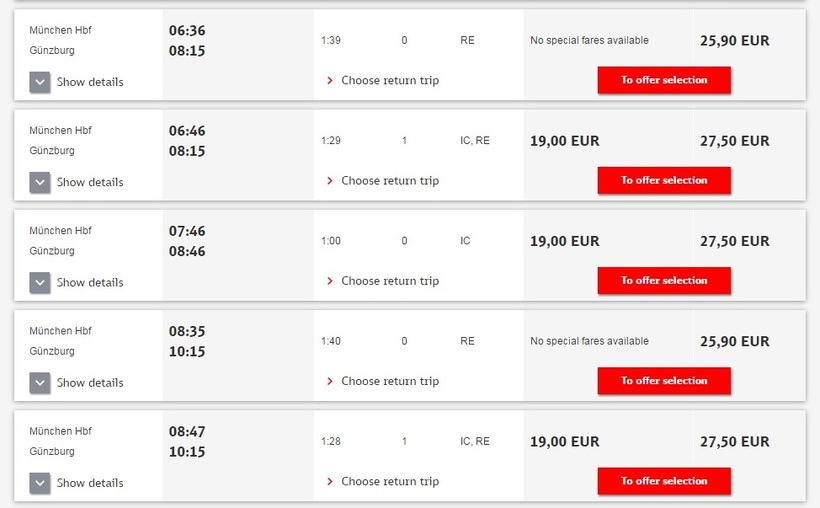 Я Вам уже рассказывала о наших с мужем путешествиях в Ульм, Эрдинг и Регенсбург. И конечно же, мои дорогие, я обязательно поделюсь с Вам опытом железнодорожной поездки в Гюнцбург. Здесь все просто. Сначала заходите на сайт Deutsche Bahn и подбираете наиболее подходящий для Вас поезд в этом направлении. Вот фрагмент расписания с сайта.