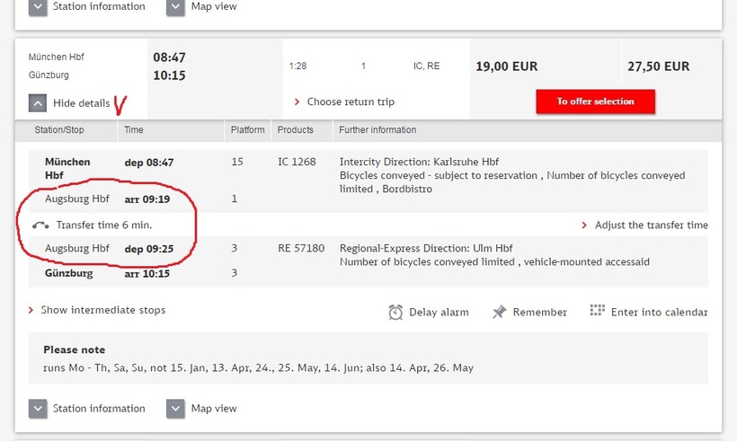 Правда, есть один нюанс. Внимательно изучайте расписание и не допустите такую же ошибку, как я в свое время. Как я уже писала вначале этого рассказа, мы с мужем и ребенком ездили в Леголенд. Тогда я приобрела билеты на поезд и, добравшись до вокзала, мы всей семьей погрузились на нужный нам рейс. Едем, улыбаемся и щебечем между собой. В общем, все нормально и все довольны. Доехав до станции Augsburg, из нас троих веселым остался только наш ребенок. После того, как все пассажиры начали спешно выходить из нашего вагона, у мамы с папой, то есть у нас, были очень испуганные лица. На мониторе в вагоне было написано, что это конечная остановка. Мы с мужем и ребенком вышли на перрон. Я сразу первому попавшемуся служащему вокзала тыкаю наши билеты и нервно произношу слово «Гюнцбург». Глянул немецкий железнодорожник в билет, улыбнулся и показал на передние вагоны нашего поезда (видать не первые такие «лопушки» ему попались). Как оказалось, по прибытию на станцию Augsburg у нашего поезда отцепили несколько вагонов и он под другим номером с меньшим количеством вагонов последовал в Гюнцбург. Вот такое вот приключение было :). Так это нам еще повезло. На некоторых маршрутах необходимо перебегать с одной платформы на другую. Вот я обвела информацию о такой пересадке на станции Augsburg красным кружочком.