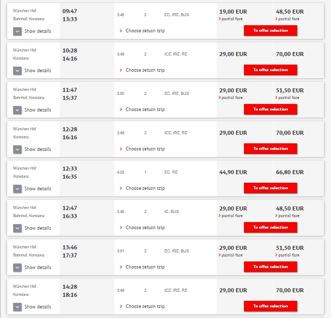 При планировании поездок на общественном транспорте по Германии первым делом я обращаюсь к сайту немецких железных дорог. Подробно о железных дорогах Германии можно прочитать здесь. Сайт Deutche Bahn предлагает различные варианты поездок из Мюнхена в Констанц, даже с пересадками на автобус, но можно выбрать и поездку только на поезде. В случаях, если последний сегмент поездки осуществляется на региональном автобусе, то цена билета на него в общую стоимость не включена (partial fare). В большинстве случаев при поездке на поезде придется сделать 2 пересадки, но есть варианты и с одной. Время в пути займет немногим менее 4 часов. Расписание можно посмотреть здесь.