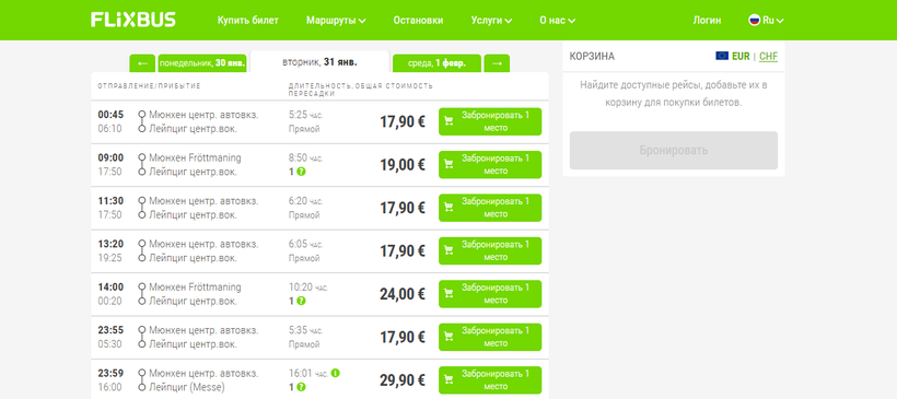 Еще один сайт, который нужно изучить перед поездкой – это портал транспортной компании FlixBus. Я уже неоднократно замечала, что иногда стоимость проезда на автобусе оказывается раза в 1,5-2 дешевле, чем путешествие на поезде.