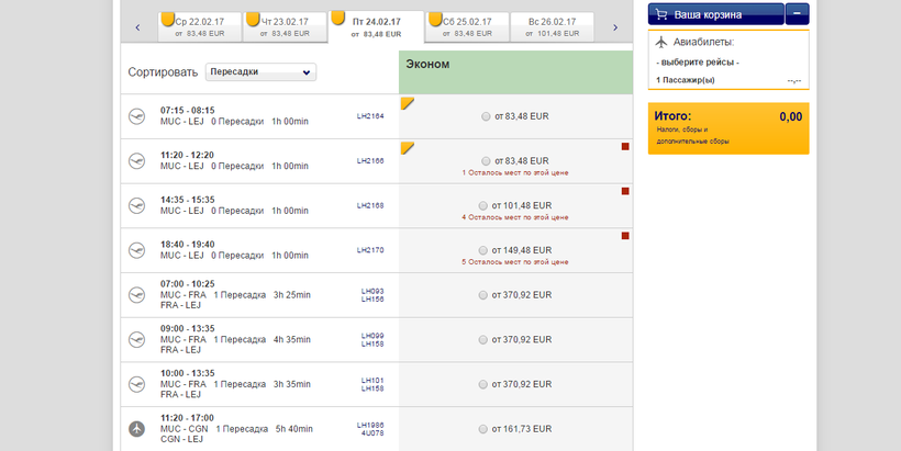 Билет на самолет обойдется от 83 евро. К сожалению, о распродажах в Lufthansa приходится только мечтать.
