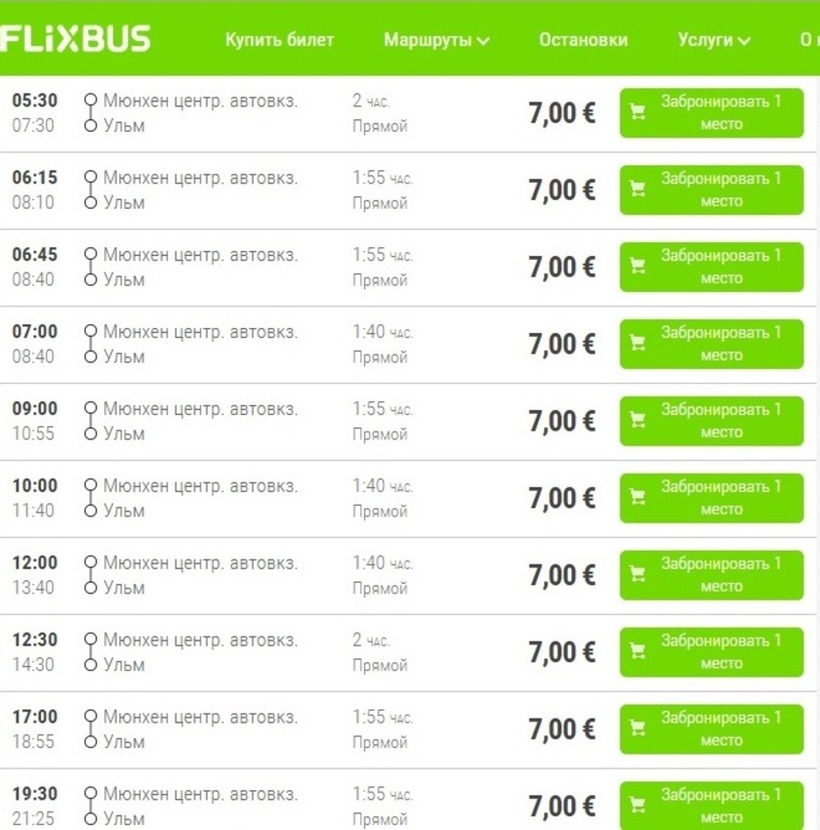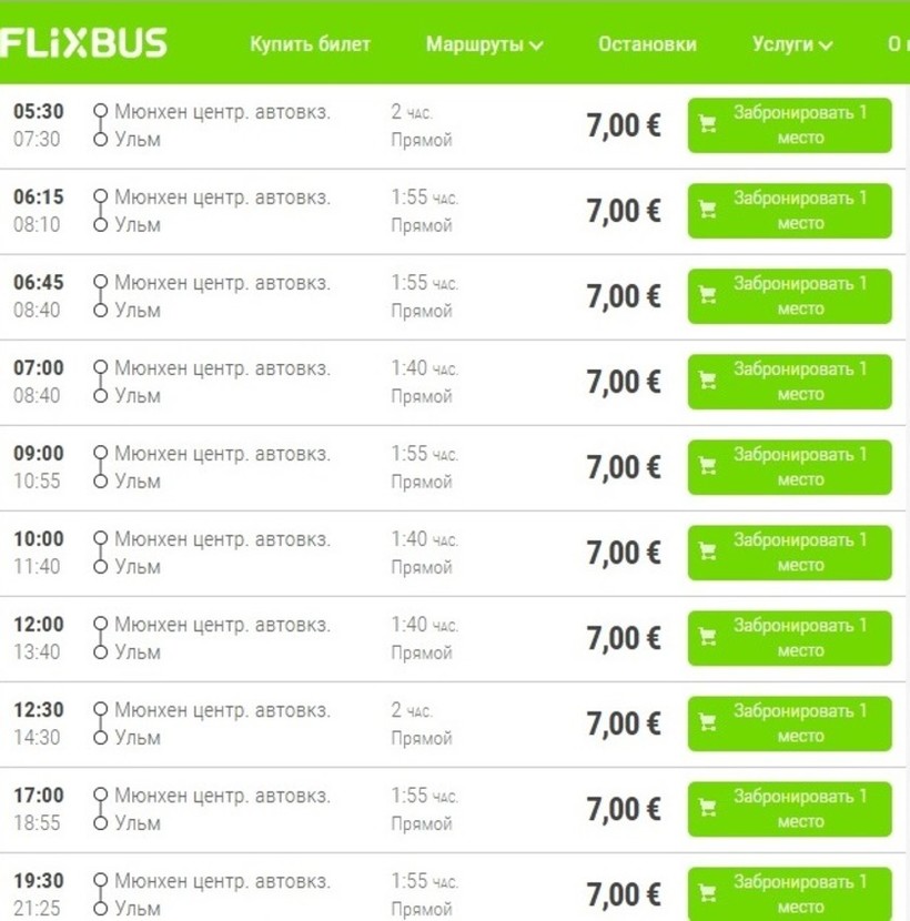 Изначально мы с мужем планировали совершить это путешествие по железной дороге. Муж уже даже начал изучать в Интернете расписание движения поездов до Ульма и составлять маршрут поездки, но я вспомнила одну интересную вещь. Германия является родиной одного из самых бюджетных автобусных перевозчиков – компании Flixbus. Ее услугами мы с мужем несколько раз пользовались, когда путешествовали по Италии. Полезла на официальный сайт компании и нашла около пятнадцати прямых рейсов из Мюнхена до Ульма, которые отправляются ежедневно с 05:30 до 21:00. Вот фрагмент расписания.